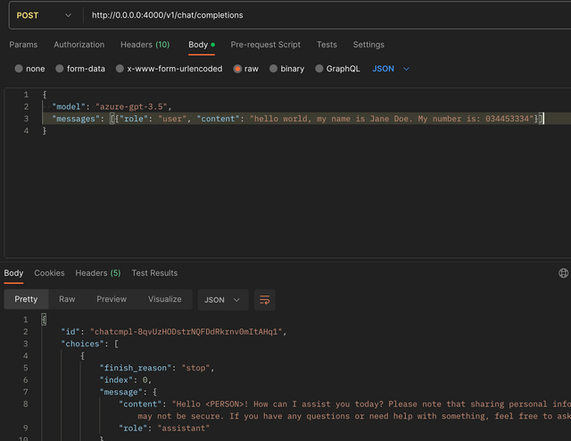 2. LLM Input: "hello world, my name is [PERSON]. My number is: [PHONE_NUMBER]"